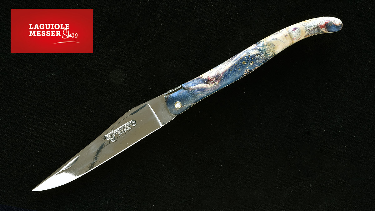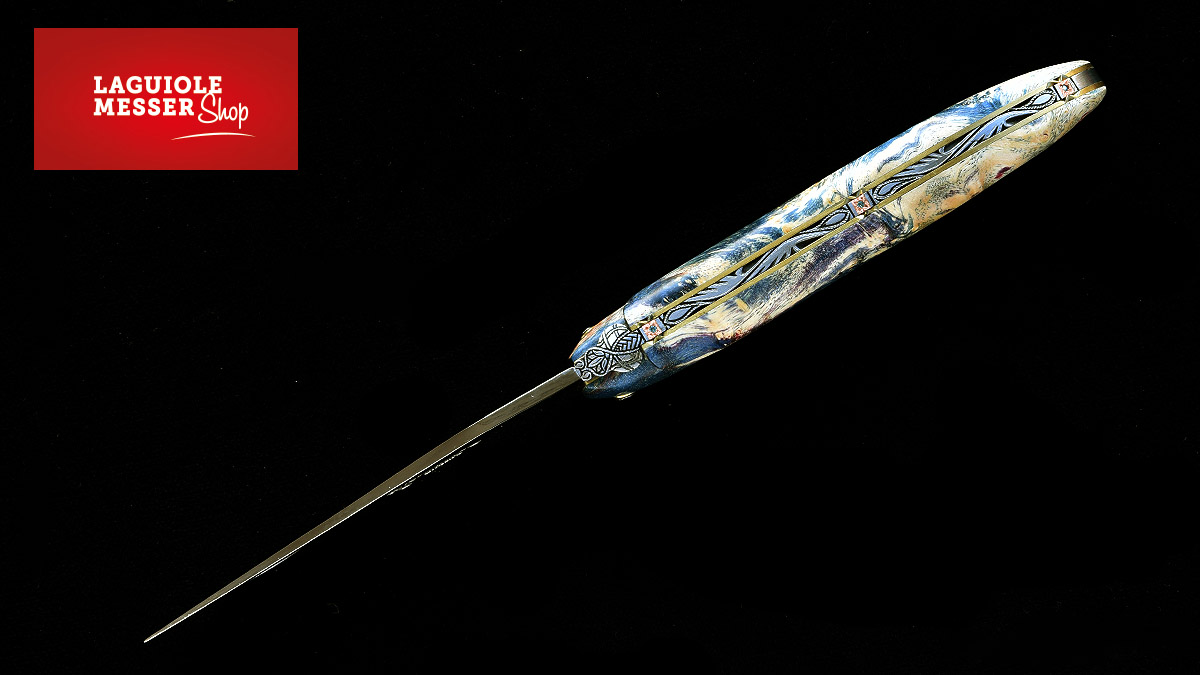 Dieses Meistermesser wurde von einem einzigen Maître Coutelier geschaffen und existiert weltweit nur einmal. Der Griff aus stabilisierterEclipse Loupe de Sureau (Holunder) beeindruckt mit einer lebendigen Maserung in Blau-, Creme- und Goldtönen - ein natürlicher Blickfang mit viel Tiefe und Charakter.