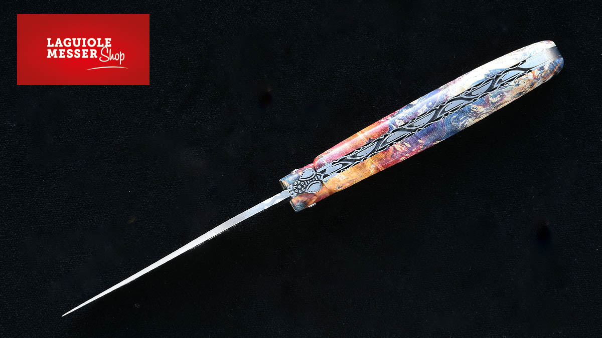 Dieses Meistermesser wurde von einem einzigen Maître Coutelier geschaffen und existiert weltweit nur einmal. Der Griff aus stabilisierter Loupe de Sureau (Holunder) beeindruckt mit einer lebendigen Maserung in Rot/Blau-, Creme- und Goldtönen - ein natürlicher Blickfang mit viel Tiefe und Charakter.