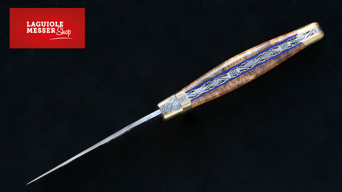 Laguiole en Aubrac - Meistermesser „Loupe d'Amboine Dorée - Laiton - bleu"