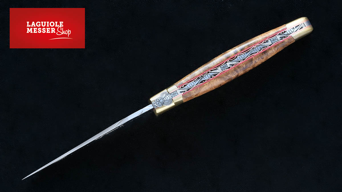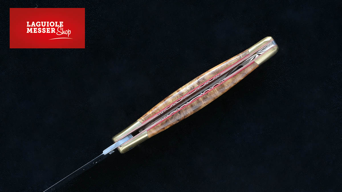 Laguiole en Aubrac - Meistermesser „Loupe d'Amboine Dorée - Laiton - rouge"