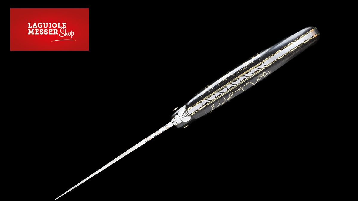 Dieses exklusive Taschenmesser besticht durch ein aussergewöhnliches Design und meisterhafte Handarbeit. Der Griff besteht aus einer edlen Kombination von schwarzem Ebenholz und Onyx, durchzogen von feinen goldfarbenen Messingintarsien, die dem Messer eine luxuriöse, fast schmuckartige Ausstrahlung verleihen.