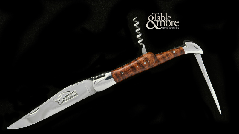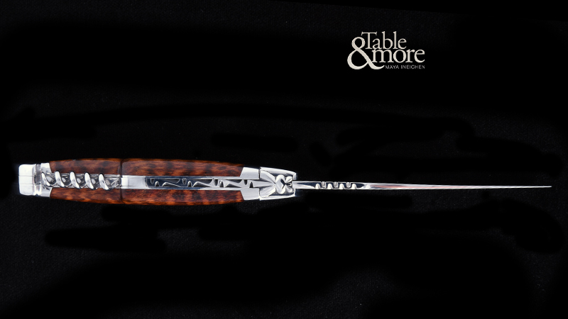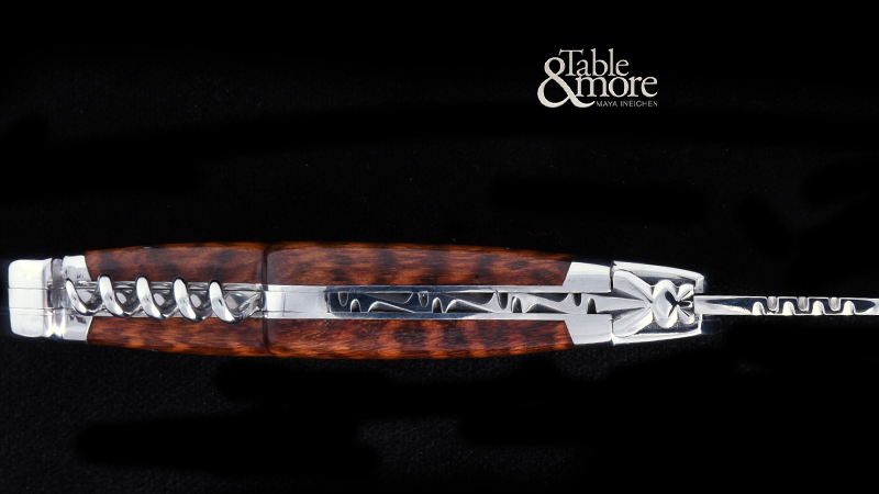 Laguiole Klappmesser mit Amourette-Griffschalen (Schlangenholz, tire-bouchon et poinçon) aus der Prestige Linie von Honoré Durand. Die Biene ist massiv geschmiedet und nicht nur gestanzt. Die Messerklinge wird aus rostfreiem 12c27 Sandvik Edelstahl hergestellt. Die Heftbacken sind aus Edelstahl, mattiert, satiniert. Die auffallend schöne Maserung des Amourette-Holzes macht jedes Messer zu einem zu einem Unikat. Das Die Griffschalen sind von Hand gearbeitet. Der Korkenzieher und der Dorn fügen sich harmonisch in den Heftrücken.